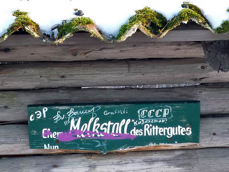 steht am Wegesrand der ehemalige Melkstall des Rittergutes. Das Hinweisschild mit seinen kyrillischen