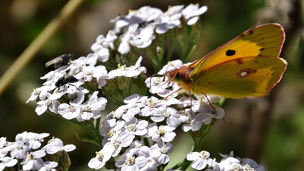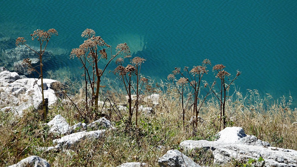 Erfreulicherweise gibt es auf dem Rückweg wieder zahlreiche neue Bildmotive zu entdecken, vor allem auf der Uferseite, die auf dem Hinweg noch nicht im Fokus war. Wie klar das Wasser im Speicher ist, lässt sich besonders gut an den Felsbrocken und an den Baumstümpfen und -ästen unmittelbar am Uferrand erkennen. Was auch immer die Farbe des Speichersees verursacht, das Türkis eignet sich hervorragend als Hintergrund für verschiedene Motive am Uferrand wie z.B. die jetzt, Ende September, bereits weitgehend verblühten Schmalblättrigen Weidenröschen, der ebenfalls schon verblühte Gemeine Bärenklau oder auch die Vogelbeeren. Und dann taucht auf einer Scharfgarbe auch noch ein Schmetterling auf, offensichtlich ein Gelbling. Nur welche Art genau? Ein Postillion? Eine Goldene Acht? Oder vielleicht ein Alpen-Gelbling? Keine Ahnung. Jedenfalls ein höchst willkommenes Objekt für eine kleine Makrostudie.